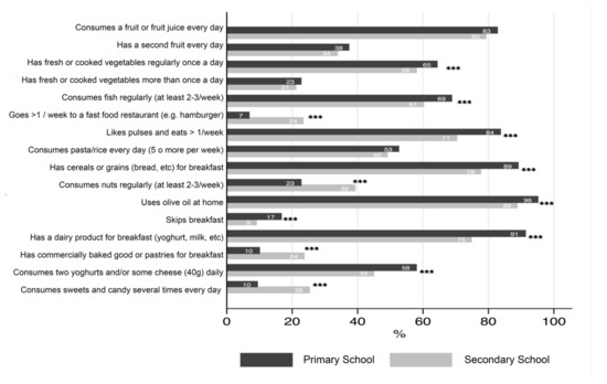 In line with other similar studies [16,33,49], we observed that primary school children had a higher degree of adherence to the MD than secondary school students. This could be explained by adult supervision and control over children’s diets, an influence that is progressively lost as an individual grows up. Some studies have shown that this parental control is associated with following healthy dietary habits and patterns [50,51,52].
