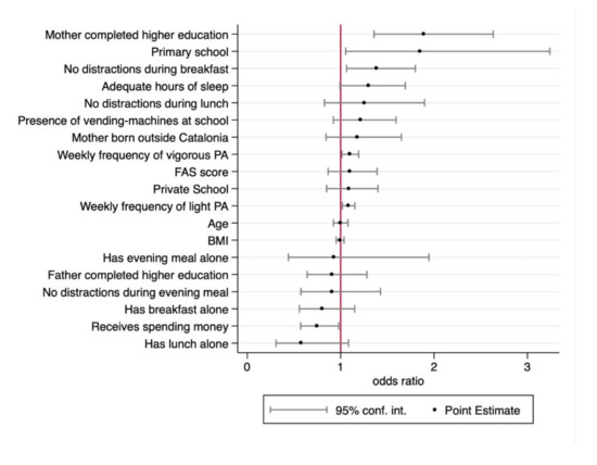 Figure 2 shows the results of the point estimates for the logistic regression, with the ORs presented in order of magnitude. As explained above, for this logistic model, the variable KIDMED score was recodified into two categories: Suboptimal (low and moderate adherence to MD) and optimal. Four factors stood out as being positively predictive of following an optimal MD. First, we observed that children and adolescents whose mothers had completed higher level education were more likely to have optimal adherence to a MD (OR = 1.89; 95% CI: 1.35–2.63). It was also interesting to note that, according to the data obtained in the questionnaire, the mother was responsible for the children’s food intake in 66% of primary school students and in 58% of secondary school students, while both mother and father were jointly responsible in 23% and 30% of cases, respectively. Second, with an OR of 1.84, boys and girls from primary school levels were more likely to follow an optimal MD than secondary school students, but with a really wide confidence interval (95% CI: 1.05–3.23). Third, the absence of distractions during breakfast was also a good predictor of optimal adherence to a MD (OR = 1.39; 95% CI: 1.06–1.81).