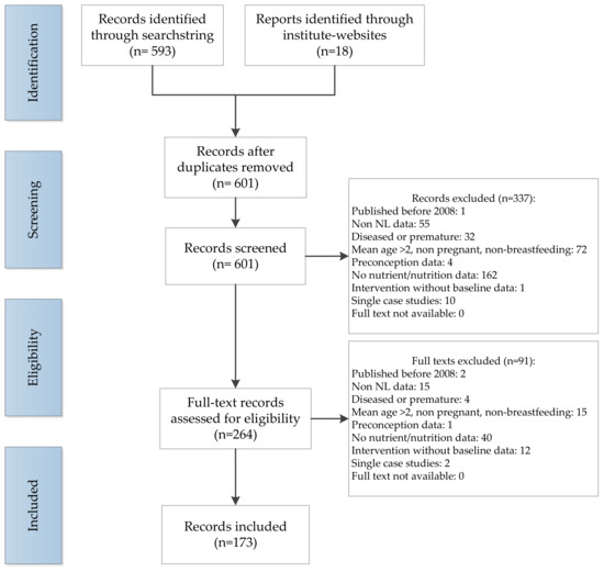 Titles and abstracts were screened independently by two reviewers (N.K., S.t.B.). Predefined exclusion criteria were used: Studies published before 2008; did not contain Dutch data; included a population with a medical illness or premature infants; the population was not pregnant, breastfeeding, or had a mean age above two years; preconception data; no data on food or nutrient intake, supplement use or nutrient status; intervention studies without reporting baseline data; case studies. Subsequently full texts were retrieved and assessed based on the selection criteria stated above. If the full text could not be retrieved, they were excluded. Disagreement on the inclusion of a study was resolved through consensus or the consultation of a third reviewer (J.V.-K.). The flow diagram of the study selection is provided in Figure 1.