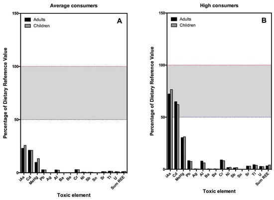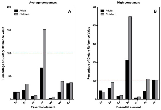 Bar plot indicating the percentage of the dietary reference values (DRVs) of essential elements provided by the consumption of mussels in adults and children. (A) Average consumption (percentile 50); (B) high consumption (percentile 97.5). Red dotted line indicates 100% of the DRVs of each element. Shaded area between lines indicates.