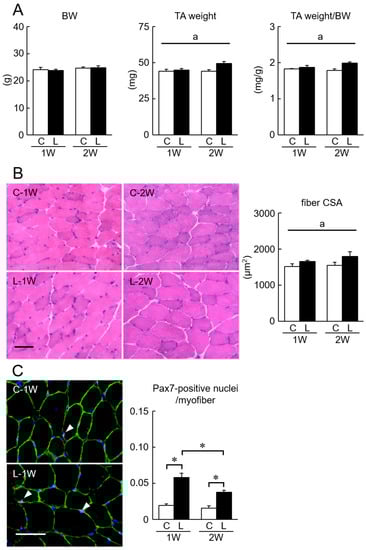 There was no significant change in the population number of Pax7-positive nuclei a fiber of TA muscle in the C group during the experimental period. In the L group, the population of Pax7-positive nuclei was significantly increased (200% and 138% at 1 and 2 weeks after lactate administration, respectively), compared with that in the C group (Figure 1C, p < 0.05).