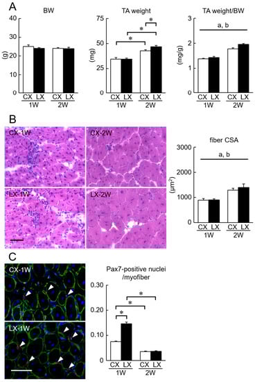 (A) Effects of oral lactate administration on BW and TA weight in cardio-toxin (CTX)-injected mice. Effect of oral lactate administration on CTX-injected TA muscle fiber CSA (B) and the number of Pax7-positive nuclei per muscle fiber (C). Representative images of histochemical and immuno-histochemical staining in CTX-injected TA muscle are shown. Arrowheads indicate the Pax7-positive nuclei. Scale bar = 50 µm. CX: CTX-injected group. LX: lactate-administered after the CTX-injection group. 1W and 2W: 1 and 2 weeks after CTX injection, respectively. See Figure 1 for other abbreviations. Values are means ± SEM. n = 7 per group. a and b: Significant main effect of lactate and time, respectively. p < 0.05. *: p < 0.05.