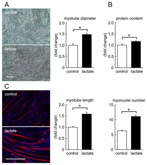 We examined the effects of lactate on myotube formation of C2C12 cells. The typical images of myotubes, on the 5th day of differentiation, with or without lactate in the medium were shown in Figure 3. In the lactate-administered cells, myotubes have a wider diameter, longer length, and more myonuclei compared with the control. A significant increase in the myotube diameter and muscular protein content was induced by lactate (Figure 3A,B, p < 0.05). Lactate administration also increased myotube length as well as myo-nuclei number (Figure 3C, p < 0.05).