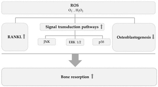 Impact of reactive oxygen species (ROS) on bone turnover [,,,,,,]. ROS promote bone resorption by enhancing receptor activator of nuclear factor-kappa B ligand [RANKL]-induced osteoclast activity, by activation of osteoclastogenesis related signal transduction cascades (c-Jun N-terminal kinase (JNK), p38 mitogen-activated protein kinases (p38), extracellular signal-regulated kinase (ERK 1/2)), and by suppressing osteoblastogenesis. ↑, activation; ↓ inhibition.