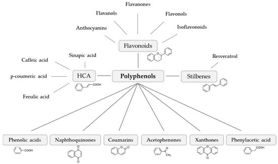 Polyphenol classification (modified from Crozier et al. []) The nine polyphenol subgroups are classified according to their chemical structure and are found throughout the plant kingdom. HCA, hydroxycinnamic acids.