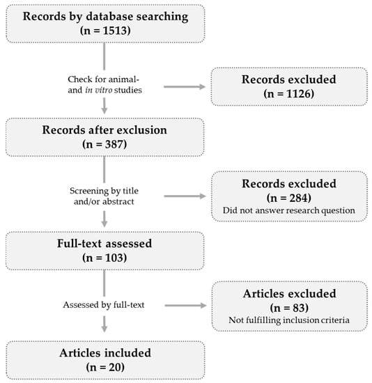 Study selection diagram. The literature search revealed 1513 hits (PubMed filters: publication date (from 01/01/2008 to 31/12/2018) and species (humans). After removal of further animal- and in vitro studies 387 records were screened. Full-text was assessed for 103 records and 83 articles did not meet the inclusion criteria. Twenty articles were included.