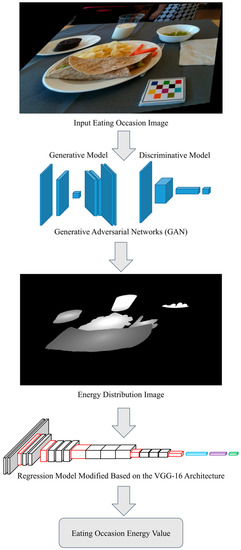Since there is no public data set available for training our generative model, the data set of image pairs, consisting of eating occasion images and corresponding energy distribution images, were constructed using the Food in Focus study. The purpose of this data set was to learn the mappings from food images to the food energy distribution images [33]. This data set was based on the ground truth food labels, segmentation masks, and energy information from the study where known foods and amounts were provided [35]. To build this data set, ground truth food labels, segmentation masks, food energy information, and the presence of the known size fiducial marker were required. To the best of our knowledge, we are the only group that has collected such a food image data set with all required information listed above. We used GAN [34] architecture to train the generative model for the task predicting the food energy distribution image, as GAN has shown impressive success in training generative models [27,28,29,36,37]. In addition, GAN is able to effectively reduce the adversarial space during training [34] compared to other generative models, such as Variational Autoencoders (VAEs) [38]. Our image-to-energy data set described in Section 2.1 could not cover all food types, eating scenes, and all possible food combinations. Therefore, GAN’s characteristic reducing adversarial space was important for our task, as it reduced the chance of the generative model overfitting on training image pairs. The energy value of the meal image is estimated based on the learned food energy distribution image by training a CNN. Figure 1 shows the design of the proposed end-to-end food energy estimation based on a single-view eating occasion image.
