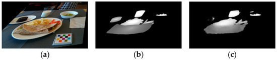 Repeat the above process for all , where is total number of food items in the eating occasion image, and then overlay all segments onto the ground truth energy distribution image whose size is the same as image . Here, we show a pair of image and the energy distribution image , as shown in Figure 2a,b, accordingly. The estimated energy distribution image shown in Figure 2c is denoted as , which is learned from training on pairs of images and the ground truth energy distribution image .