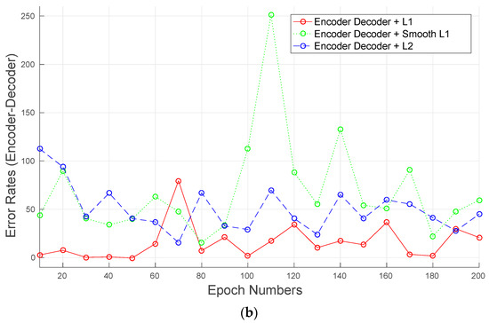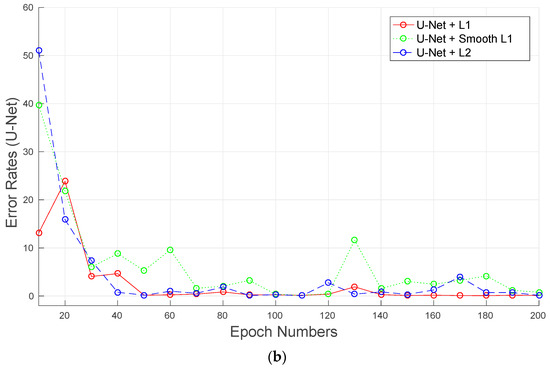 We compared the energy estimation error rates at different epochs for the two different cGAN models we used, the encoder-decoder architecture (Figure 5) and the U-Net architecture (Figure 6). Compared to the encoder-decoder architecture (Figure 5), the U-Net architecture (Figure 6) was more accurate and stable. The reason is that information from the “encoder” can be directly copied to the “decoder” layers in the U-Net architecture to provide precise locations [45], which is an idea similar to ResNet [25].