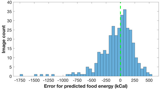 The error distribution of predicted food energies for 347 eating occasion images is shown in Figure 7. We found that the average energy estimation error was 209 kilocalories. An overestimation is displayed as a positive number. The average ground truth for all eating occasion images was 546 kilocalories, and the average ground truth for breakfast, lunch, and dinner eating occasion images was 531 kilocalories, 603 kilocalories, and 506 kilocalories, respectively. The average energy estimation error we obtained was 209 kilocalories, and the average energy estimation error for breakfast, lunch, and dinner eating occasion images was 204 kilocalories, 211 kilocalories, and 210 kilocalories, respectively. Several sample eating occasion images for overestimated food energy are shown in Figure 9, and eating occasion images for underestimated food energy are shown in Figure 10 accordingly.