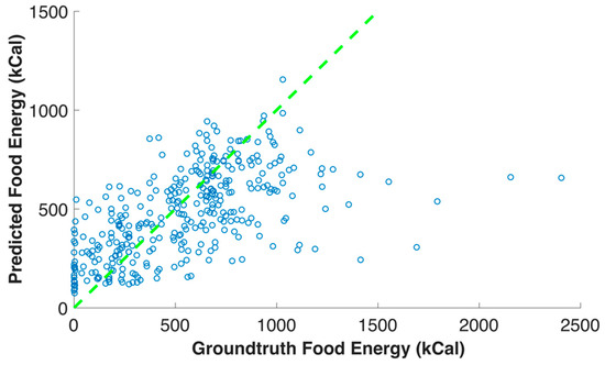 Relationship between the ground truth food energy and the food energy predicted for each eating occasion.
