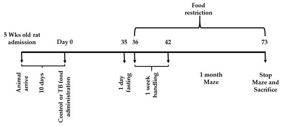 Figure 1 and Figure 2 summarize the feeding and schedules for experiment 1 and 2. All of the rats had free access to a standard chow (CRF-1, Oriental Yeast Co. Ltd., Tokyo, Japan) for 10 days after admission. On day 0, the rats were divided into two groups. In both experiments, the control rats (CN rats), was fed the CRF-1 chow and the second group (TB rats), was fed the standard CRF-1 chow supplemented with 0.05% (W/W) of TB (Oriental Yeast Co. Ltd.) over the entire experiment time.