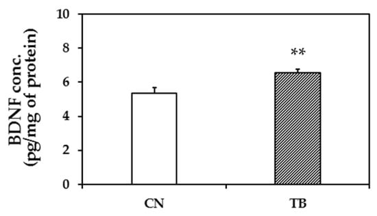 The effect of theobromine (TB) on the brain-derived neurotrophic factor (BDNF) protein level in the medial prefrontal cortex (mPFC). BDNF protein level in the mPFC of TB-fed rats (TB rats) was significantly higher than that of control rats (CN rats). Hippocampal BDNF protein levels did not differ between groups (Figure S1). Values are the mean ± S.E.M. (n = 5 for each group). ** p < 0.01; significant difference between groups.