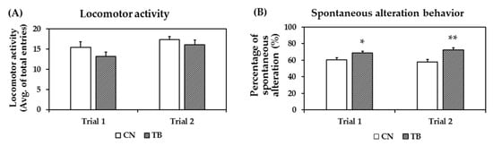 The exploration rates were not affected by TB supplementation, as the total number of arm entries between groups did not show any significant difference (Figure 5A). TB rats displayed spontaneous alternations of 68.9 ± 1.72 and 72.5 ± 2.41 of choices, which was significantly higher than the 60.2 ± 2.59 and 57.8 ± 3.04 of values for the control group (Figure 5B, p = 0.014, p = 0.002), as measured across two trials, respectively.
