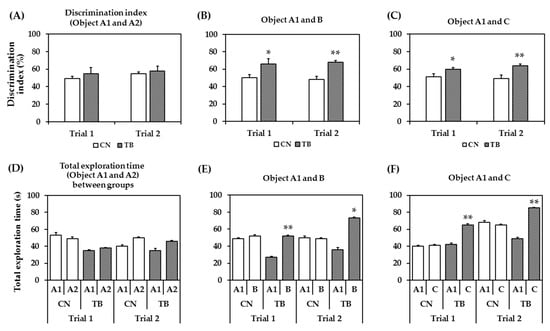 In Figure 6C, the DIs for object A1 and novel object C (after 24 h object B was changed to new object C) were significantly higher in TB rats in both trials (p = 0.041 for trial 1, p = 0.012 for trial 2). The results suggest that TB rats has a > 50% DI, implying a higher novel object preference.