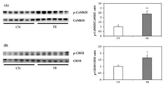 Many studies have suggested that CaMKII phosphorylates the transcription factor CREB and transforms it into active form p-CREB [,,]. p-CREB then initiates transcription and translation of proteins/receptors required for neuronal plasticity. This could be confirmed by inhibiting p-CREB and subsequent inhibition of new protein synthesis and, therefore, impair memory cognition []. In the current study, TB supplementation significantly upregulated CaMKII, as indicated by increased ratios of p-CaMKII/CaMKII in the cortical tissues (Figure 7A). TB augmented the levels of p-CREB concomitantly, as compared to those of the control rats (Figure 7B). Therefore, we speculate that TB-induced an increase in the levels of p-CaMKII, and p-CREB contributed to the improvement of neuronal plasticity, hence, the learning and memory of TB rats. BDNF has been implicated in LTP that occurs in the hippocampus and other brain regions. LTP plays a prime role in learning and memory [,]. Improvements of working memory were accompanied with an increased level of BDNF proteins in the frontal cortex [,]. Consistently, TB-fed rats, in the current study, had also higher BDNF levels in the mPFC. Moreover, the improvements in learning and memory were positively correlated with the levels of memory-related substrates—p-CaMKII, p-CREB, and BDNF (Table S2). Therefore, it is conceivable that TB-instigated increases in the levels of p-CaMKII, p-CREB, and BDNF improved the learning and the memory of the rats. TB supplementation did not have an effect on ERK1/2 pathway, as indicated by no change in the level of p-c-Raf, p-MEK1/2, p-90RSK; and p-MSK1 in the mPFC (Figure S3). However, the cause remains to be clarified.