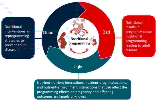 Considering the good and bad sides of nutritional programming during pregnancy, there is still an ugly side of it. Currently, little information exists on certain nutrients for women with pre-existing deficiencies, as the dietary reference intakes are established for healthy individuals. Almost all dietary reference intake reports lack long-term offspring outcome data to accurately inform recommendations for women in the pregnancy stage. However, currently in human studies it is difficult to confirm causation linking maternal nutrition status with phenotypes in offspring. Also, these cohorts do not identify molecular mechanisms by which the phenotype is generated and aid in developing specific nutritional interventions for a wide spectrum of adult diseases. As a consequence of ethical considerations concerning what is achievable or not in human studies, animal models are essential. It is for this reason that much of our knowledge of the type of nutritional insults driving the programming process, the critical time-window of vulnerability for nutritional insults, potential mechanisms underpinning nutritional programming, and reprogramming strategy largely come from studies in animal models.
