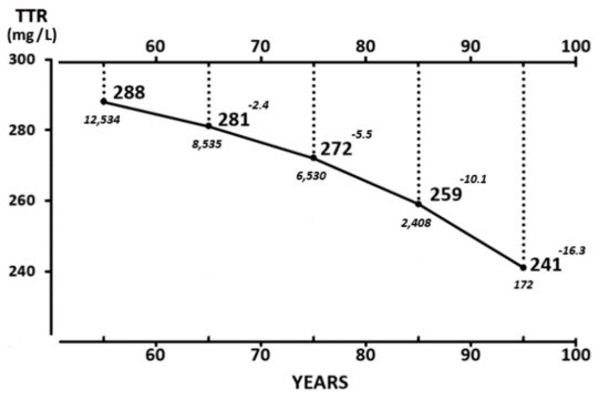 Mean TTR concentrations measured in healthy elderly subjects aged 65 to 100 years. TTR values are measured in 17,645 healthy U.S. elderly citizens (5796 men and 11,849 women) stratified into four groups (61–70, 71–80, 81–90, and 91–100 years of age) [79]. Mean values recorded in both sexes are combined owing to the lack of sexual difference in TTR after 65 years and are expressed in bold characters. The number of participants and increasing deviation from plateau levels in each decennial category are shown in italics. TTR values recorded in both sexes during the last decades are well above 200 mg/L, which is regarded as the lower limit of normalcy, implying that these healthy centenarians, despite their on-going sarcopenia, do not face a life-threatening environment.