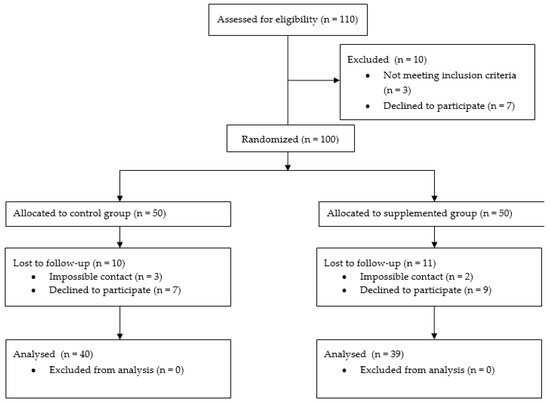 The eligible participants were informed of the study’s objectives and those who agreed to participate signed the consent form. At recruitment, they were allocated in one of the study groups, depending on the day of the week: Monday and Thursday for the supplemented group and Tuesday and Wednesday for the control group, where only the supplemented group ingested two capsules containing 400 IU of RRR-alpha-tocopherol consecutively, totaling 800 IU (588 mg of alpha-tocopherol). The capsule contained 98% RRR-alpha-tocopherol acetate, as assessed according to the method of Lira (2017) [21]. The study complied with the Consolidated Standards of Reporting Trials—CONSORT (Figure 1).