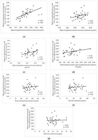 Correlations between alpha-tocopherol in breast milk obtained in collection 2 and maternal variables of the supplemented group. Natal, Rio Grande do Norte, Brazil, 2017–2018. (a) Correlation between alpha-tocopherol in breast milk from collection 1 and 2; (b) correlation between alpha-tocopherol in breast milk from collection 2 and serum from collection 1; (c) correlation between alpha-tocopherol in breast milk in serum from collection 2; (d) correlation between alpha-tocopherol in breast milk of collection 2 and the vitamin E intake of collection 1; (e) correlation between alpha-tocopherol in breast milk from collection 2 and serum cholesterol from collection 2; (f) correlation between alpha-tocopherol in breast milk from collection 2 and low-density lipoprotein (LDL) from collection 2; (g) correlation between alpha-tocopherol in breast milk from collection 2 and high-density lipoprotein (HDL) from collection 2. r = Pearson’s correlation coefficient; p value = level of significance (p < 0.05 = statistically significant).