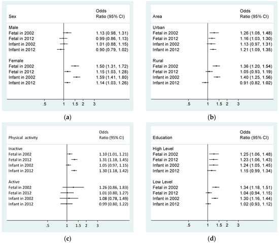 The SAS version 9.4 (SAS Institute Inc., Cary, NC, USA) was used for all statistical analyses, and a two-sided p value <0.05 was considered to be statistically significant. Odds of abdominal obesity for the fetal-exposed group and the infant-exposed group, compared with the nonexposed group, were examined by the maximum likelihood method using the logistic regression model. Analyses were adjusted for sex, residential areas, education level, marital status, household income, current drinking status, current smoking status, and physical activity. To investigate whether the associations between fetal and infant exposure to famine and abdominal obesity were affected by social environment in later life, we subsequently stratified the analyses according to sex, residential areas, physical activity, and education level. The odds ratios (95% confidence interval (CI)) of abdominal obesity in the fetal- and infant-exposed groups compared with the nonexposed group were calculated within each category of the stratified variables. The stratified variables were not adjusted in the corresponding models. The odds ratios (95% CI) were plotted in a graph using Stata 13.0. Sensitivity analysis was also performed in this study. First, we selected the 75th percentile of EDR as the cutoff point, and an EDR of 150.0% was used to define the severity of famine for the purpose of distinguishing severely and moderately severely affected famine areas more significantly. Second, participants with BMI ≥28.0 kg/m2 who were categorized as having systemic obesity according to the Chinese criteria were excluded to prevent the interaction between systemic obesity and abdominal obesity.