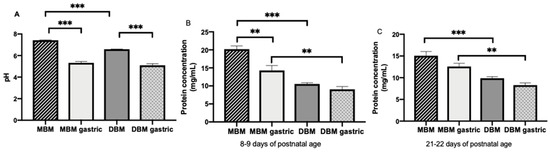 (A) pH values of milk and gastric contents at 1-h postprandial time from 20 preterm infants (26–36 weeks of gestational age (GA)) fed mother’s own breast milk (MBM) and donor breast milk (DBM). Values are mean ± SEM, n = 36 for each group (n = 20 for 8–9 days and n = 16 for 21–22 days of postnatal age). (B) Total protein concentration in milk and gastric contents from infant fed MBM and DBM at 8–9 days (n = 20) (C) Total protein concentration in milk and gastric contents from infant fed MBM and DBM at 21–22 days (n = 16). Asterisks show statistically significant differences between variables (*** p < 0.001; ** p < 0.01) using the Wilcoxon matched-pairs signed-rank test.