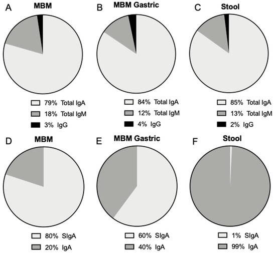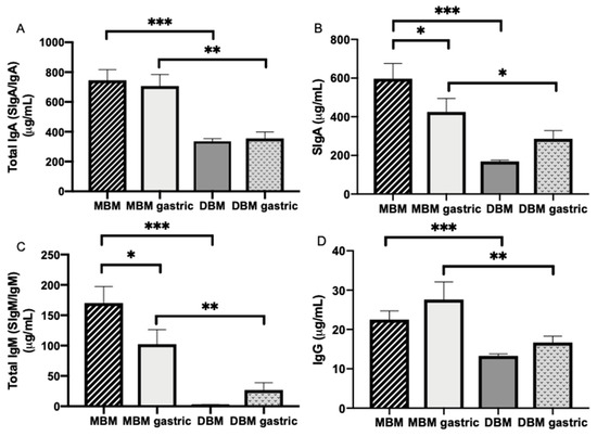 SIgA and total IgM concentration significantly decreased (Figure 2B,C) 28.8 and 39.8%, respectively, from MBM to the preterm infant stomach but did not change for total IgA and IgG (p > 0.05, Figure 2A,D). Total IgA, SIgA, total IgM and IgG concentrations did not change from DBM to the preterm stomach (Figure 2A–D).
