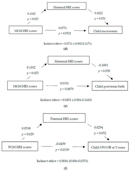 Mediation analysis of grandparental HEI scores on grandchild outcome through parental HEI scores. (a) Maternal grandmother (MGM) HEI scores–grandchild birth weight (BW)–maternal HEI scores mediation analysis; (b) MGM HEI scores–grandchild low birth weight (LBW)–maternal HEI scores mediation analysis; (c) MGM HEI scores–grandchild BMI at five years–maternal HEI scores mediation analysis; (d) MGM HEI scores–grandchild macrosomia–maternal HEI scores mediation analysis; (e) MGM HEI scores–grandchild post-term birth–maternal HEI scores mediation analysis; (f) paternal grandmother (PGM) HEI scores–grandchild overweight and obese (OW/OB) at five years–paternal HEI scores mediation analysis. BW, birthweight; BMI, body mass index; HEI, healthy eating index; LBW, low birth weight; MGM, maternal grandmother; OW/OB, overweight and obese; PGM, paternal grandmother.