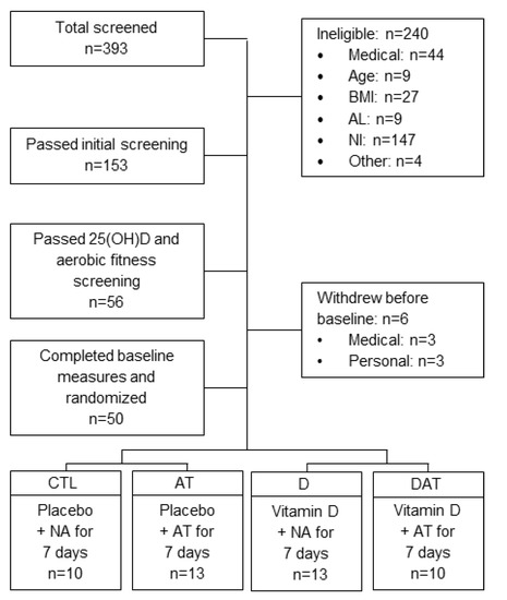 Recruitment for a randomized placebo-controlled clinical trial, in which aged adults completed seven consecutive days of aerobic training on a treadmill or continued usual activities (normal activity during the 13th week of vitamin D supplementation or place)bo. Serum 25(OH)D, serum 25-hydroxyvitamin D; AL, activity level; AT, aerobic training; CTL, control; D, vitamin D; DAT, vitamin D + aerobic training; NI, not interested; NA, normal activity.