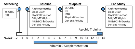 Schematic representation of the subject timeline. Serum 25(OH)D, serum 25-hydroxyvitamin D; GXT, graded treadmill exercise test; iCa, serum ionized calcium; iPTH, serum intact parathyroid hormone; MRI/MRS, magnetic resonance imaging/spectroscopy; NIRS/DCS, near-infrared spectroscopy/diffuse correlation spectroscopy.