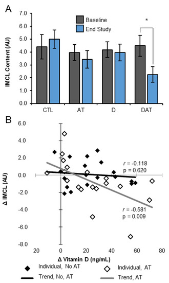 Secondary, exploratory analysis using paired sample t-tests revealed a significant within group change in IMCL in DAT only (p = 0.035) (Figure 3A). The change in IMCL was inversely correlated with change in 25(OH)D in AT and DAT (r = −0.581, p = 0.009), but not in sedentary D and CTL counterparts (r = −0.118, p = 0.620) (Figure 3B). Within group comparisons did not reveal significant changes in the [IMCL]/[EMCL] ratio or EMCL.