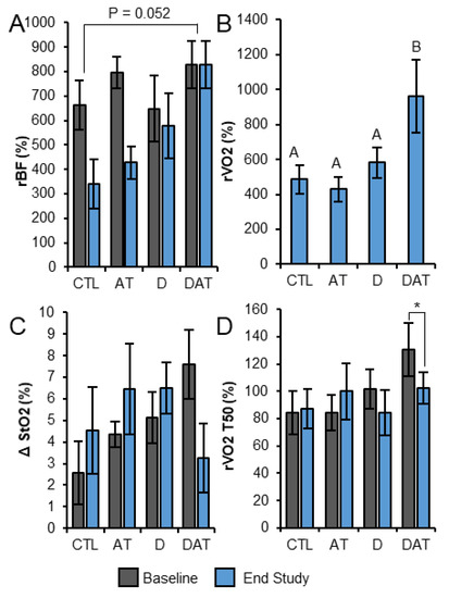 Figure A1 illustrates a typical hemodynamic response in rBF, rVO2, and StO2 in human subjects during fatiguing exercise. Our secondary outcome analysis of NIRS/DCS data during the fatiguing exercise protocol indicated a significant effect of supplementation (p = 0.017, η2 = 0.140) in rBF. Further analysis using ANOVA revealed a main effect (p = 0.049), and post hoc analyses indicated a strong trend towards rBF increase from CTL to DAT (p = 0.052) (Figure 4A). At baseline there were no group differences in blood flow during exercise. DAT endpoint rBF (827 ± 488 percent baseline) was higher than CTL (385 ± 148 percent baseline, p = 0.010) and AT (426 ± 332 percent baseline, p = 0.013). There were no significant group by time interactions in rVO2 during exercise; however, secondary analysis by ANOVA revealed DAT was significantly higher at endpoint than CTL (p = 0.007), AT (p = 0.002), and D (p = 0.013) (Figure 4B). No significant differences in ΔStO2 were found between intervention groups during fatiguing exercise at baseline or at the end of the study.