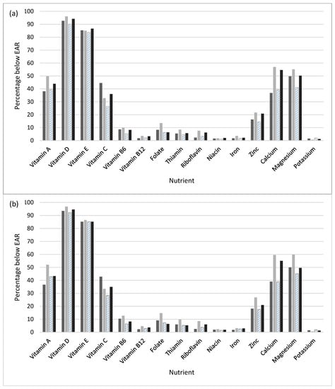 Three cumulative sources were used to generate estimated usual intake data for the 15 nutrients of interest, which were those included in the ILSI North America Fortification database: a) foods and beverages as naturally occurring, b) foods and beverages including E/F, and c) foods and beverages including E/F and DSs. These nutrients included vitamins A, D, E, C, B6, and B12, folate, thiamin, riboflavin, niacin, iron, zinc, calcium, magnesium, and potassium. For folic acid and folate, dietary folate equivalents (DFE) was used [19]. Percent below the EAR (%>AI for potassium), and % ≥UL were estimated as appropriate. We estimated the proportion of the population with nutrient intakes from sources as naturally occurring, enriched/fortified, and supplements greater than or equal to the ULs with the exception of thiamin, riboflavin, potassium, and vitamins A, E, and B12, for which ULs have not been estimated [19,20,21]. The ULs for niacin and magnesium were derived from non-food sources (enriched/fortified or DSs) [19,22].