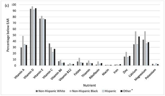 Percent less than the estimated average requirement (EAR) for naturally occurring plus enriched/fortified nutrient intake by race/ethnicity and poverty index ratio (PIR) category: (a) <131%, (b) 131–85%, and (c) >185%. * The other race/ethnicity group included non-Hispanic persons reporting multiple races.