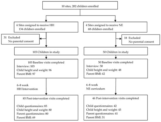 To address these barriers of widespread implementation and dissemination of HH and more fully engage parents, the current study aimed to test the comparative effectiveness of the adapted HH versus the standard curriculum delivered by the programs (Standard Nutrition Education (NE)). Our primary outcomes were changes in diet, physical activity, and screen time among both parents and children. Group differences in body mass index trajectories were also analyzed as an exploratory aim. It was hypothesized that postintervention, children and caregivers receiving the HH intervention would exhibit (1) improved dietary intake; (2) higher levels of physical activity; and 3) lower levels of screen time as compared to the NE participants.