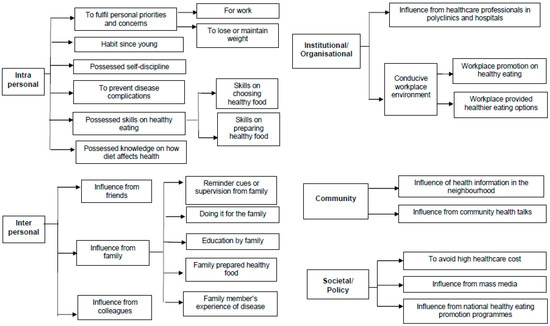 The main recurrent themes were observed at the interpersonal level where family influence from spouse and children played an important role in meeting the recommendation. This could be in the form of reminder cues from family, “...my children will say ‘mom that’s salty, don’t eat’ or you know, they will say ‘this is too fat, don’t eat’, you know what I mean? They will remind me and keep a look-out on my diet.” (AMK 075, 56 years old Chinese female) or through education by family, “Like if I buy certain things, my eldest son will teach me to read the food label and tell me, this is not good, artificial, a lot of additives. So, it’s more or less indirectly encouraging me to buy better quality food, more healthy food.” (AMK 017, 57 years old Chinese female). For some, the family prepared healthy food, particularly the wife or mother in the household. This was highlighted by male participants who were married, “My wife knows that it is very important for the family to avoid unhealthy food, so I do not need to tell her what to do […] leave it to her. She goes to the wet market or supermarket to buy the more healthy grocery and uses them to prepare our meals.” (HOU 028, 68 years old Indian male). For others, their family members’ experience of disease motivated them, “Because I don’t want to end up like my parents, you know, they have high blood, high cholesterol, high sugar. That is why I must control my diet, it is very sad to see how they suffer from these diseases.” (YIS 005, 57 years old Malay female).