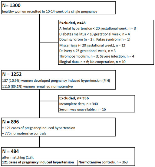At baseline, 1300 women were recruited through advertisements. The women who did not meet all the inclusion criteria after the observation period ended (n = 48), as well as those whose data were incomplete (n = 340), were excluded. In 16 cases, the serum was unavailable. After the exclusion, we qualified 896 women for this study (121 women who developed pregnancy-induced hypertension and 775 women who remained normotensive). After matching the participants, we examined 484 women in two groups. The study group (n = 121) included the women who subsequently developed pregnancy-induced hypertension (106 cases of gestational hypertension and 15 cases of preeclampsia), and the control group (n = 363) comprised the women who remained normotensive.