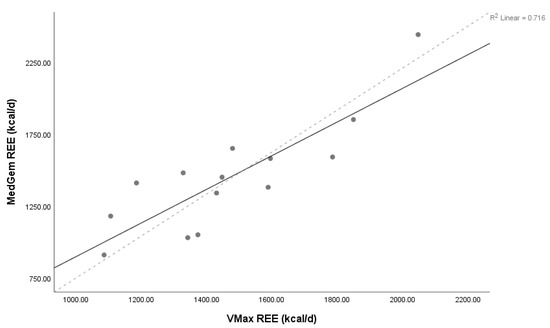 Concordance between MedGem and Vmax. Lin’s concordance correlation coefficient (ρC) = 0.80, 95% confidence interval 0.55–0.92, n = 14. Solid line represents line of identity, dashed line represents line of best fit. Abbreviations: REE = resting energy expenditure, d = day.