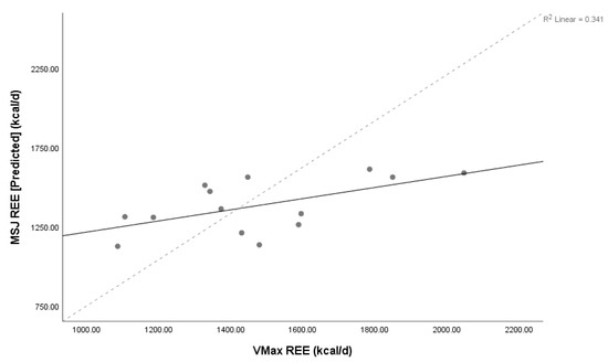 Concordance between Mifflin St Jeor equation and Vmax. Lin’s concordance correlation coefficient (ρC) = 0.47, 95% confidence interval 0.07–0.75, n = 14. Solid line represents line of identity, dashed line represents line of best fit. Abbreviations: REE = resting energy expenditure; MSJ = Mifflin St. Jeor equation, d = day.