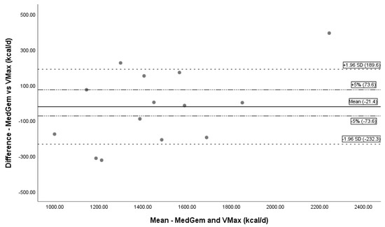 Bland–Altman plot Vmax and MedGem. Bland–Altman plot showing the mean bias and limits of agreement between MedGem and Vmax. The solid line represents mean bias (−21.4 kcal/day), a systematic undermeasurement of REE by MedGem. Dashed lines represent confidence intervals (± 1.96 SD). Dotted and dashed lines are a reference line for ±5%difference. Abbreviations: REE = resting energy expenditure; d = day.