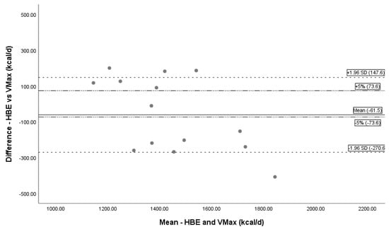 Bland–Altman Plot HBE and Vmax. Bland–Altman plot showing the mean bias and limits of agreement between Vmax and HBE. The solid line represents mean bias (−61.5 kcal/day), a systematic underprediction of REE by HBE. Dashed lines represent confidence intervals (± 1.96 SD). Dotted and dashed lines are a reference line for ±5% difference. Abbreviations: REE = resting energy expenditure; HBE = Harris Benedict equation, d = day.