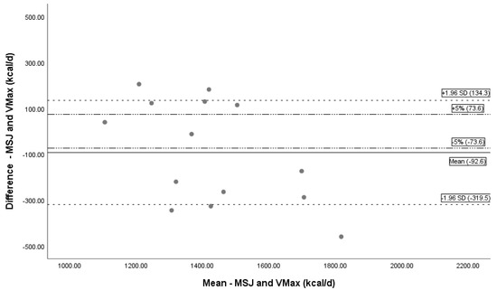 Bland–Altman Plot MSJ and Vmax. Bland–Altman plot showing the mean bias and limits of agreement between MSJ and Vmax. The black solid line represents mean bias (−92.6 kcal/day), a systematic underprediction of REE by HBE. Dashed lines represent confidence intervals (± 1.96 SD). Dotted and dashed lines are a reference line for ± 5% difference. Abbreviations: REE = resting energy expenditure; MSJ = Mifflin St. Jeor equation, d = day.