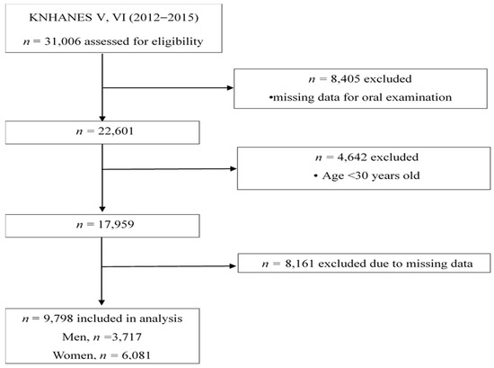 This study was based on the fifth and sixth Korea National Health and Nutrition Examination Survey (KNHANES) conducted in 2012 and 2015 [13,14]. The KNHANES is a national survey, designed according to stratified, multi-stage, clustered probability sampling, which is conducted by the Korea Centers for Disease Control and Prevention. Among the 31,006 individuals (8058 in 2012, 8018 in 2013, 7550 in 2014, and 7380 in 2015) who participated in the survey, 17,959 adults aged between 30 and over 60 were included (Figure 1). Among them, 8161 subjects were further excluded because of insufficient data on dietary, socio-economic, and health-related behaviors. As a result, a total of 9798 Korean adults (3717 men and 6081 women) were included for the final analysis. The study was approved by the Institutional Review Board of Korea Centers for Disease Control and Prevention. Written informed consent was obtained from all participants.