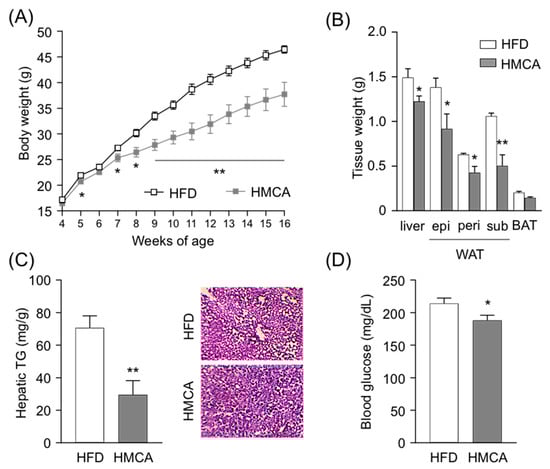 We first investigated changes in metabolic parameters following HMCA feeding in a mouse model of HFD-induced obesity. In this experiment, 4-week-old mice were fed an HFD containing 1% HMCA for 12 weeks (Table 1), and tissue characteristics and biochemical parameters were assessed at the end of the treatment. Gains in body weight were significantly lower in HMCA-supplemented HFD-fed mice during growth (Figure 1A). The mass of white adipose tissue (WAT) was also significantly lower in HMCA-supplemented HFD-fed mice than in those fed an HFD, whereas no significant difference was observed in the weight of BAT (Figure 1B). Moreover, a significant decrease in the weight of livers from HMCA-supplemented HFD-fed mice was observed, and corresponded to a decrease in hepatic TG in comparison to HFD-fed mice (Figure 1B,C). Plasma levels of glucose, insulin, and total cholesterol were significantly lower in HMCA-supplemented HFD-fed mice (Figure 1D, Figure S1A,B), whereas their TG and NEFAs plasma levels were comparable (Figure S1B). HMCA intake suppressed both elevation of plasma glucose levels and increases in hepatic TG accumulation, thereby preventing HFD-induced obesity.