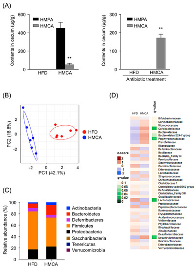 We identified and quantified HMCA and HMPA contents in cecal samples collected following 1 week of HFD containing with 1% HMCA in the mice. Interestingly, HMPA but not HMCA was detected in the cecum of HMCA-supplemented HFD-fed mice (Figure 2A; left), whereas only HMCA was detected when mice received antibiotic treatment (Figure 2A; right). Then, HMPA was detected in the urine of mice fed HFD supplemented with HMCA or HMPA (Figure S2A). In addition, the plasma pharmacokinetic profiles following intraperitoneal injection showed that there was no possibility of interconversion between HMCA and HMPA by the host metabolism (Figure S2B,C). These data support the idea that HMCA taken orally could be converted into HMPA in the intestine by gut microbiota and that HMPA was absorbed in the body. We evaluated the composition of gut microbiota in HFD-fed and HMCA-supplemented HFD-fed mice. Principal coordinate analysis (PCoA) based on unweighted Unifrac distances indicated significant clustering by diet type, with complete separation of the cecal microbiota of HMCA-supplemented HFD-fed mice from that of HFD controls along the PCoA1 axis (Figure 2B). Taxonomic analysis of the cecal microbiota showed an increased abundance of Bacteroidetes and Actinobacteria, with a reduction in the population of Firmicutes in the HFD-HMCA microbiota (Figure 2C). Furthermore, the hierarchical clustering of individual families also confirmed that HMCA intervention resulted in an increase in the population of the Bacteroidales S24-7 group and Porphyromonadaceae, which belong to the phylum Bacteroidetes (Figure 2D).