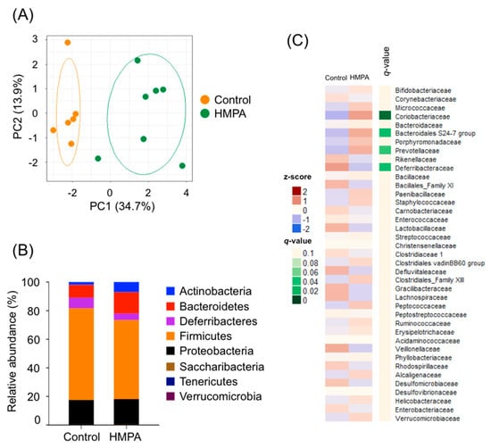 Compositions of gut microbiota in the HMPA-supplemented HFD-fed mice compared to the HFD controls. (A) PCoA of the cecal microbiota in HMPA-supplemented HFD-fed mice vs. the HFD controls based on unweighted Unifrac distances between diet groups (n = 6–7). (B) Relative abundance of the phylum level (n = 6–7). (C) Heatmap of relative abundance of major taxonomic groups at family level (mean relative abundance >0.1%) in HMPA-supplemented HFD-fed mice vs. the HFD controls (n = 6–7). FDR, q < 0.1. All data are presented as the means ± SEM. Differences were assessed by Student’s t-test. Significance is established at adjusted p < 0.05. Control, HFD containing with 1% cellulose fed mice. HFD: high-fat diet; HMPA: 3-(4-hydroxy-3-methoxyphenyl)propionic acid.