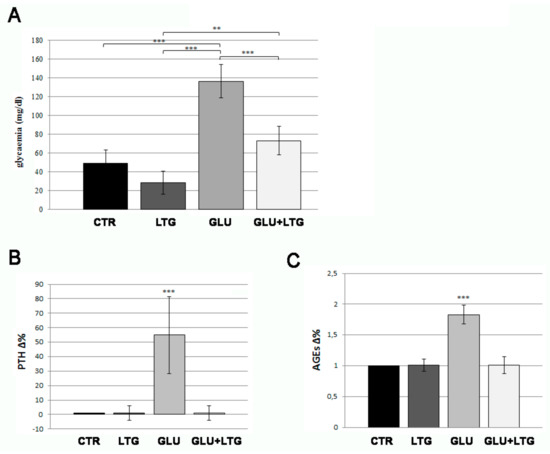 Adult fish were treated with 4% glucose solution for four weeks. Glucose treatment induced basal hyperglycemia, whose average results were equal to 137 mg/dL after 28 days of treatment (Figure 1A, +175% vs. CTR). Further, 1 nM LTG treatment partially prevented the onset of the hyperglycemia, reducing basal glycemia to 73, only 48% higher that CTR levels. Moreover, diabetic fish showed increased PTH (Figure 1B) and AGEs (Figure 1C) levels and LTG completely prevented both of these alterations, maintaining levels equal to normal ones.