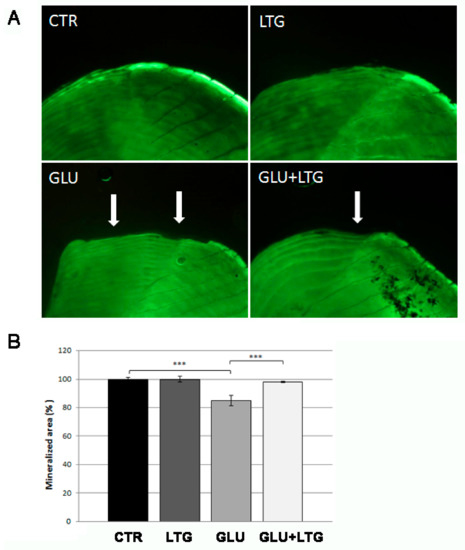 (A) Calcein vital staining of fish scales. The mineralized tissue profile can be observed in untreated (CTR) scales or treated with LTG, glucose, and GLU + LTG. Mineralized matrix resorption lacunae are indicated by white arrows. (B) Quantification of mineralized area of the scale (CTR vs. GLU, p < 0.001; GLU + LTG vs. GLU, p < 0.001). p < 0.001 (***).