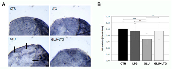 (A) Histological ALP activity assay. Enzymatic ALP activity of CTR scales or treated with LTG, GLU, and GLU + LTG can be visualized as blue staining. The areas of fish scale with a reduced ALP activity are evidenced by black arrows. (B) Biochemical ALP assay. Quantification of ALP activity was performed on same samples with a biochemical assay (CTR vs. GLU, p < 0.001) (GLU + LTG vs. GLU, p < 0.01). p < 0.01 (**) and p < 0.001 (***).