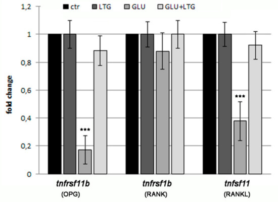 The expression analysis of genes involved in the regulation of bone tissue was done by real-time PCR in the scales after treatment with glucose and/or LTG (Figure 5). Tumor necrosis factor receptor superfamily, member 11b tnfrsf11b (fish homolog of human osteoprotegerin), and tumor necrosis factor (ligand) superfamily member 11 tnfrsf11 (fish homolog of human rankl), two important regulators of osteoclast differentiation, were found decreased in the scales of hyperglycemic fish, whereas tumor necrosis factor receptor superfamily member 1B tnfrsf1b (fish homolog of human rank) resulted in being not modulated. LTG co-treatment restored, in the GLU-treated fish, the expression level found in CTR and LTG alone.